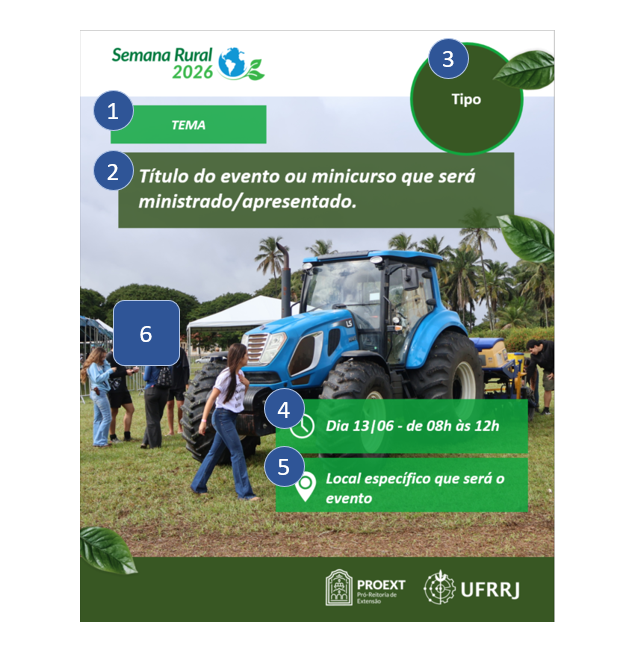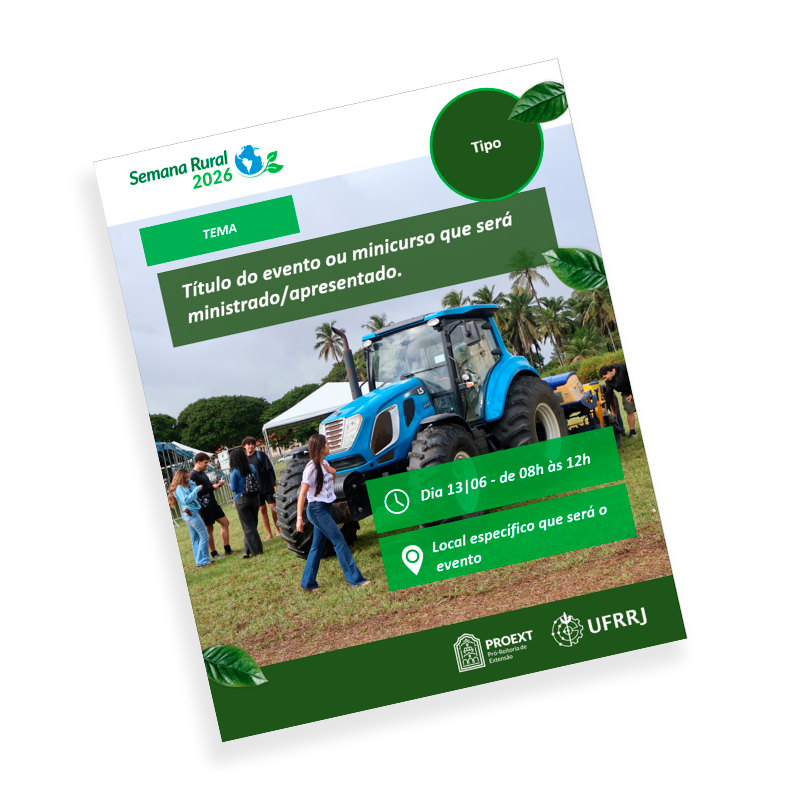 Faça download do arquivo em MS PowerPoint, escolha um template, edite com as informações do seu evento e divulgue nas suas redes sociais, marcando a Semana Rural.