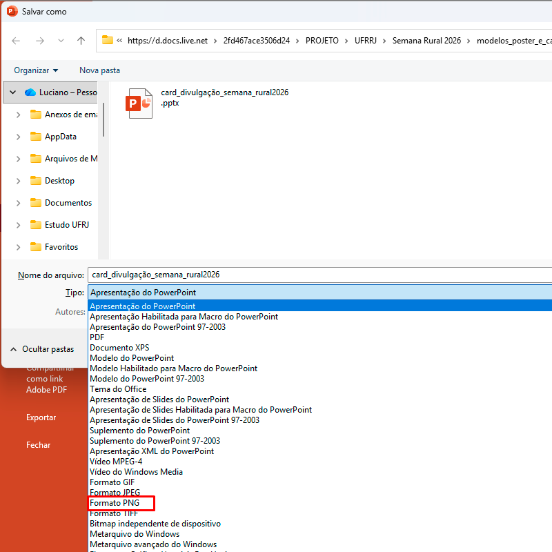 Abrirá uma janela como na imagem abaixo. Selecione o formato PNG ou JPEG