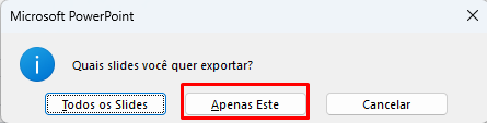 Após selecionar o formato PNG ou JPEG, clique em Salvar. Logo aparecerá uma nova janela perguntando se você quer exportar todos os slides ou apenas o atual. Selecione o botão Apenas Este